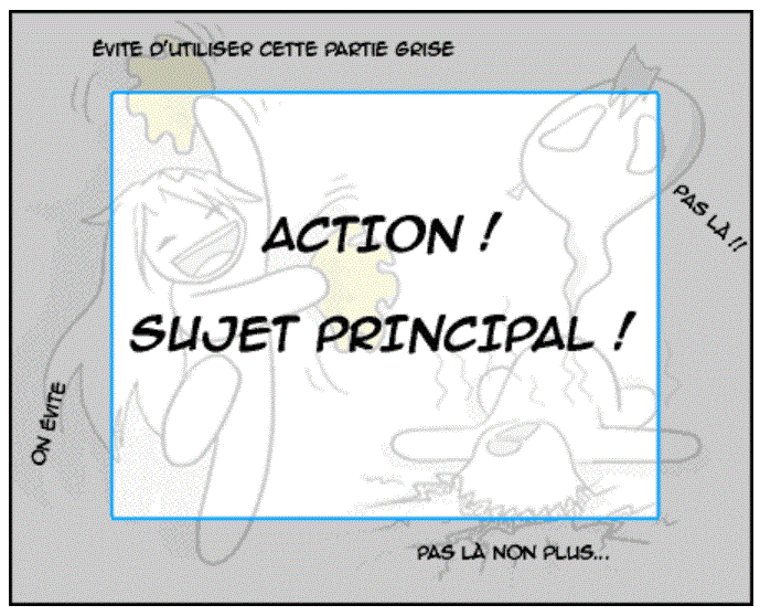 Ces cases sont des exemples de construction, les parties grises sont la zone où doit se trouver l’action principale du dessin.